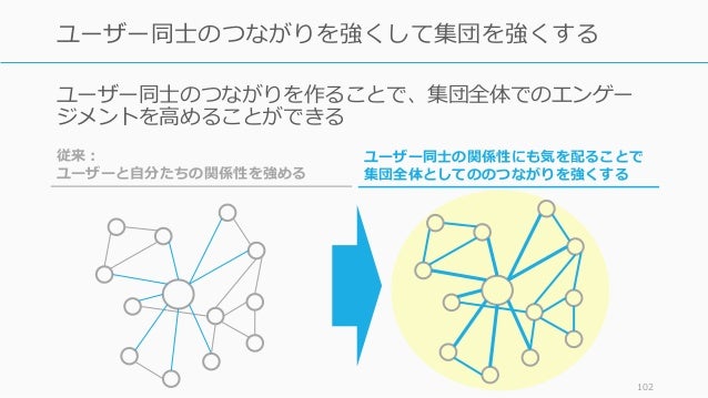- 45. 45 コミュニティ自体のマネジメントを行う コミュニティのマネジメント ユーザーグループなど、新しいつな がりを作ったり、既存のつながりを 強めることを含む活動 強くする 新しく 作る コミュニティ マネジメントは 関係性に介入する (新規、維持、強化、組み換え) 組み替える (切断も含) ✂ 維持させる