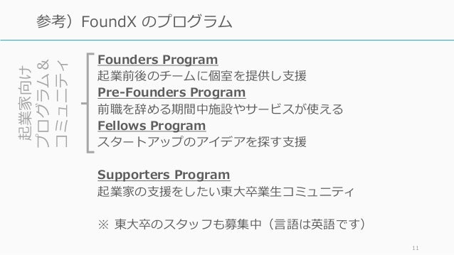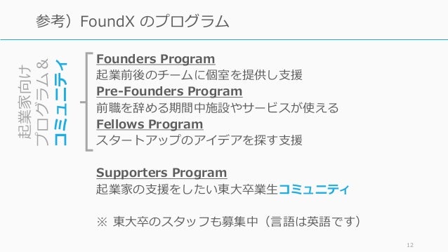 - 11. Founders Program 起業前後のチームに個室を提供し支援 Pre-Founders Program 前職を辞める期間中施設やサービスが使える Fellows Program スタートアップのアイデアを探す支援 Supporters Program 起業家の支援をしたい東大卒業生コミュニティ ※ 東大卒のスタッフも募集中(言語は英語です) 11 参考)FoundX のプログラム起業家向け プログラム& コミュニティ