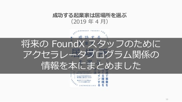 - 13. 13 成功する起業家は居場所を選ぶ (2019 年 4 月) 将来の FoundX スタッフのために アクセラレータプログラム関係の 情報を本にまとめました