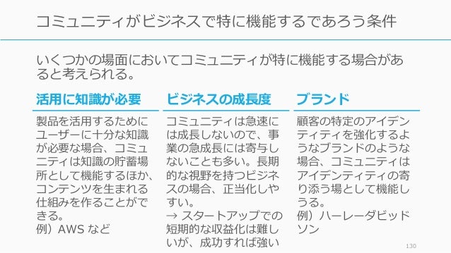 - 130. いくつかの場面においてコミュニティが特に機能する場合があ ると考えられる。 130 コミュニティがビジネスで特に機能するであろう条件 ブランド 顧客の特定のアイデン ティティを強化するよ うなブランドのような 場合、コミュニティは アイデンティティの寄 り添う場として機能し うる。 例)ハーレーダビッド ソン 活用に知識が必要 製品を活用するために ユーザーに十分な知識 が必要な場合、コミュ ニティは知識の貯蓄場 所として機能するほか、 コンテンツを生まれる 仕組みを作ることがで きる。 例)AWS など ビジネスの成長度 コミュニティは急速に は成長しないので、事 業の急成長には寄与し ないことも多い。長期 的な視野を持つビジネ スの場合、正当化しや すい。 → スタートアップでの 短期的な収益化は難し いが、成功すれば強い