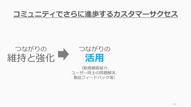 - 134. 134 つながりの 活用 つながりの 維持と強化 コミュニティでさらに進歩するカスタマーサクセス (新規顧客紹介、 ユーザー同士の問題解決、 製品フィードバック等)
