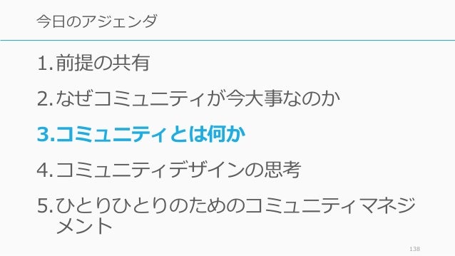 - 138. 1.前提の共有 2.なぜコミュニティが今大事なのか 3.コミュニティとは何か 4.コミュニティデザインの思考 5.ひとりひとりのためのコミュニティマネジ メント 138 今日のアジェンダ