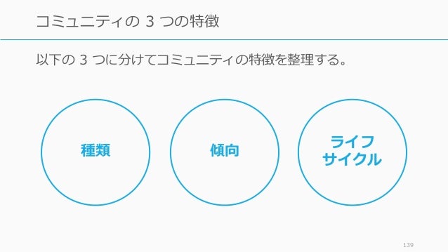 - 139. 以下の 3 つに分けてコミュニティの特徴を整理する。 139 コミュニティの 3 つの特徴 種類 傾向 ライフ サイクル