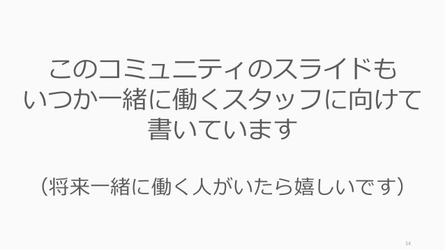 - 14. 14 このコミュニティのスライドも いつか一緒に働くスタッフに向けて 書いています (将来一緒に働く人がいたら嬉しいです)