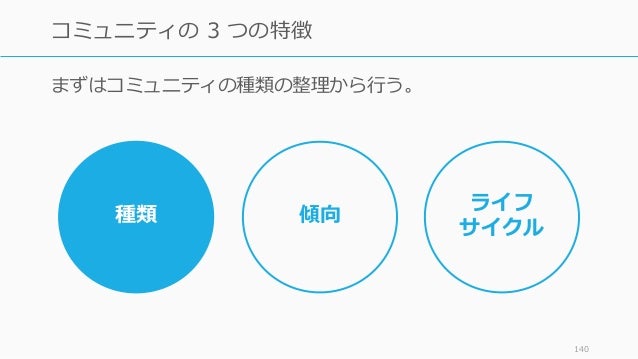 - 140. まずはコミュニティの種類の整理から行う。 140 コミュニティの 3 つの特徴 種類 傾向 ライフ サイクル