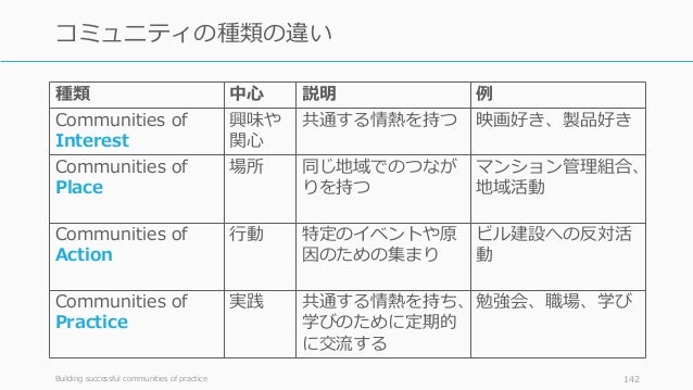 - 142. 種類 中心 説明 例 Communities of Interest 興味や 関心 共通する情熱を持つ 映画好き、製品好き Communities of Place 場所 同じ地域でのつなが りを持つ マンション管理組合、 地域活動 Communities of Action 行動 特定のイベントや原 因のための集まり ビル建設への反対活 動 Communities of Practice 実践 共通する情熱を持ち、 学びのために定期的 に交流する 勉強会、職場、学び Building successful communities of practice 142 コミュニティの種類の違い
