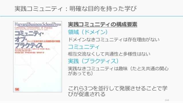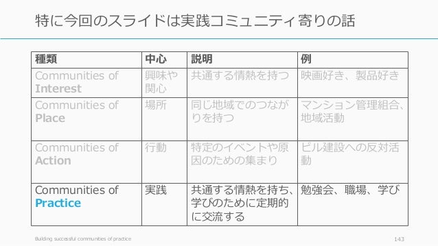 - 143. 種類 中心 説明 例 Communities of Interest 興味や 関心 共通する情熱を持つ 映画好き、製品好き Communities of Place 場所 同じ地域でのつなが りを持つ マンション管理組合、 地域活動 Communities of Action 行動 特定のイベントや原 因のための集まり ビル建設への反対活 動 Communities of Practice 実践 共通する情熱を持ち、 学びのために定期的 に交流する 勉強会、職場、学び Building successful communities of practice 143 特に今回のスライドは実践コミュニティ寄りの話