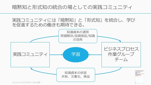 - 145. 実践コミュニティには「暗黙知」と「形式知」を統合し、学び を促進するための働きも期待できる。 コミュニティオブプラクティスから引用 145 暗黙知と形式知の統合の場としての実践コミュニティ 実践コミュニティ 学習 ビジネスプロセス 作業グループ チーム 知識資本の世話 共有、文書化、検証 知識資本の適用 問題解決/品質保証/知識 の活用