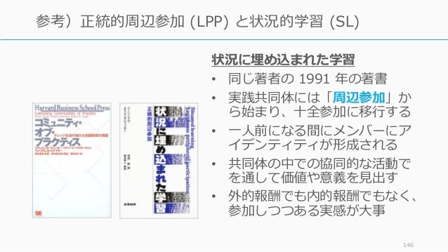- 146. 状況に埋め込まれた学習 • 同じ著者の 1991 年の著書 • 実践共同体には「周辺参加」か ら始まり、十全参加に移行する • 一人前になる間にメンバーにア イデンティティが形成される • 共同体の中での協同的な活動で を通して価値や意義を見出す • 外的報酬でも内的報酬でもなく、 参加しつつある実感が大事 146 参考)正統的周辺参加 (LPP) と状況的学習 (SL)