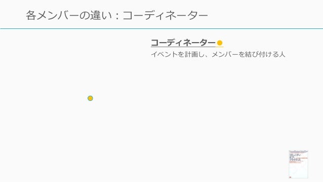 - 147. 147 各メンバーの違い:コーディネーター コーディネーター● イベントを計画し、メンバーを結び付ける人