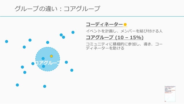 - 148. 148 グループの違い:コアグループ コアグループ コーディネーター● イベントを計画し、メンバーを結び付ける人 コアグループ (10 – 15%) コミュニティに積極的に参加し、導き、コー ディネーターを助ける