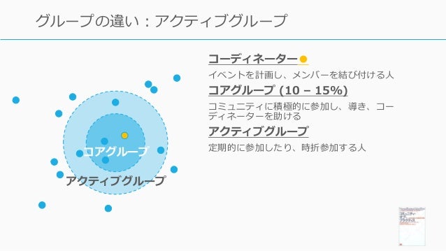 - 149. 149 グループの違い:アクティブグループ コアグループ アクティブグループ コーディネーター● イベントを計画し、メンバーを結び付ける人 コアグループ (10 – 15%) コミュニティに積極的に参加し、導き、コー ディネーターを助ける アクティブグループ 定期的に参加したり、時折参加する人