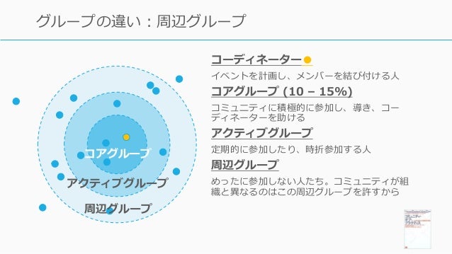 - 150. 150 グループの違い:周辺グループ コアグループ アクティブグループ 周辺グループ コーディネーター● イベントを計画し、メンバーを結び付ける人 コアグループ (10 – 15%) コミュニティに積極的に参加し、導き、コー ディネーターを助ける アクティブグループ 定期的に参加したり、時折参加する人 周辺グループ めったに参加しない人たち。コミュニティが組 織と異なるのはこの周辺グループを許すから
