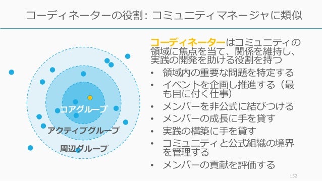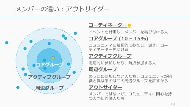 - 151. 151 メンバーの違い:アウトサイダー コアグループ アクティブグループ 周辺グループ コーディネーター● イベントを計画し、メンバーを結び付ける人 コアグループ (10 – 15%) コミュニティに積極的に参加し、導き、コー ディネーターを助ける アクティブグループ 定期的に参加したり、時折参加する人 周辺グループ めったに参加しない人たち。コミュニティが組 織と異なるのはこの周辺グループを許すから アウトサイダー メンバーではないが、コミュニティに関心を持 つ人や知的隣人たち