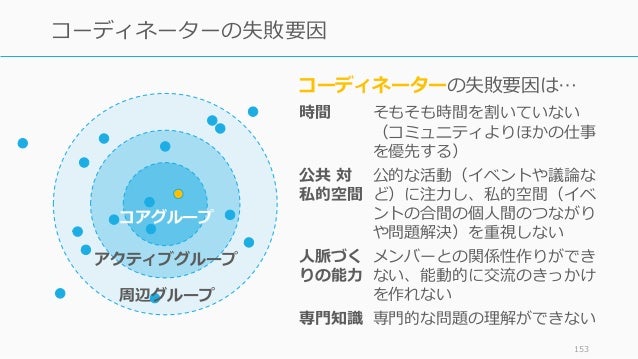 - 153. 153 コーディネーターの失敗要因 コーディネーターの失敗要因は… コアグループ アクティブグループ 周辺グループ 時間 そもそも時間を割いていない (コミュニティよりほかの仕事 を優先する) 公共 対 私的空間 公的な活動(イベントや議論な ど)に注力し、私的空間(イベ ントの合間の個人間のつながり や問題解決)を重視しない 人脈づく りの能力 メンバーとの関係性作りができ ない、能動的に交流のきっかけ を作れない 専門知識 専門的な問題の理解ができない