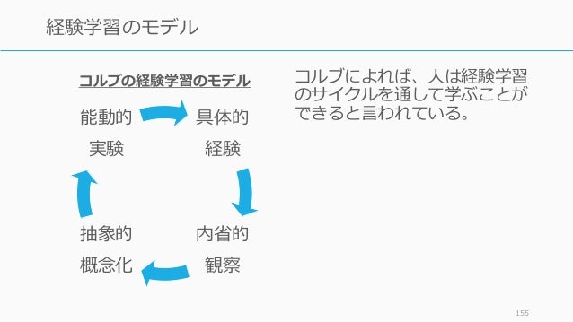 - 155. 155 経験学習のモデル コルブによれば、人は経験学習 のサイクルを通して学ぶことが できると言われている。具体的 経験 内省的 観察 抽象的 概念化 能動的 実験 コルブの経験学習のモデル