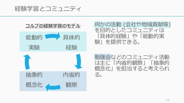 - 156. 156 経験学習とコミュニティ 何かの活動 (会社や地域貢献等) を目的としたコミュニティは 「具体的経験」や「能動的実 験」を提供できる。 勉強会などのコミュニティ活動 は主に「内省的観察」「抽象的 概念化」を担当すると考えられ る。 具体的 経験 内省的 観察 抽象的 概念化 能動的 実験 コルブの経験学習のモデル