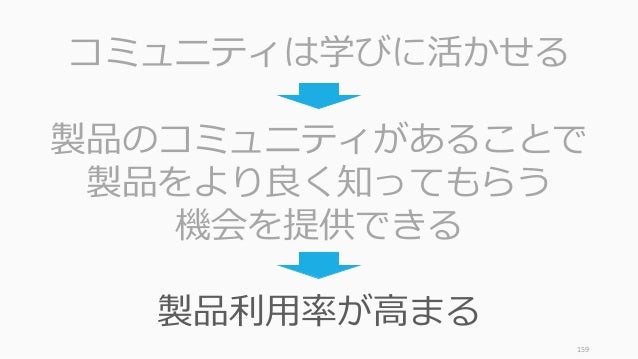 - 159. 159 コミュニティは学びに活かせる 製品のコミュニティがあることで 製品をより良く知ってもらう 機会を提供できる 製品利用率が高まる