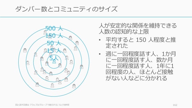 - 162. 人が安定的な関係を維持できる 人数の認知的な上限 • 平均すると 150 人程度と推 定された • 週に一回程度話す人、1か月 に一回程度話す人、数か月 に一回程度話す人、1年に1 回程度の人、ほとんど接触 がない人などに分かれる 図と話す回数は『ウェブはグループで進化する』などを参照 162 ダンバー数とコミュニティのサイズ 👤 👤 👤 👤 👤 👤 👤 👤 👤 👤 👤 👤 🙍 👤 👤 👤 👤 👤 👤 👤 👤 🙍 🙍 🙍 🙍 🙍 🙍 🙍 🙍🙍 🙍 🙍 🙍 5人 15 人 50 人 150 人 500 人