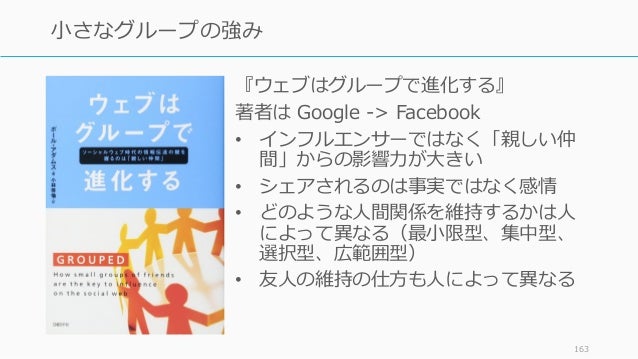 - 163. 『ウェブはグループで進化する』 著者は Google -> Facebook • インフルエンサーではなく「親しい仲 間」からの影響力が大きい • シェアされるのは事実ではなく感情 • どのような人間関係を維持するかは人 によって異なる(最小限型、集中型、 選択型、広範囲型) • 友人の維持の仕方も人によって異なる 163 小さなグループの強み