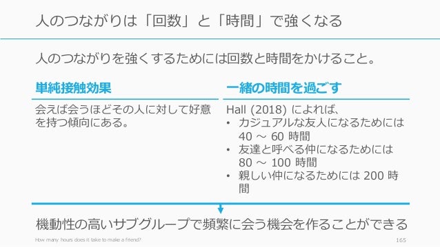 - 165. 人のつながりを強くするためには回数と時間をかけること。 How many hours does it take to make a friend? 165 人のつながりは「回数」と「時間」で強くなる 一緒の時間を過ごす Hall (2018) によれば、 • カジュアルな友人になるためには 40 ~ 60 時間 • 友達と呼べる仲になるためには 80 ~ 100 時間 • 親しい仲になるためには 200 時 間 単純接触効果 会えば会うほどその人に対して好意 を持つ傾向にある。 機動性の高いサブグループで頻繁に会う機会を作ることができる
