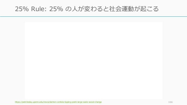 - 166. https://penntoday.upenn.edu/news/damon-centola-tipping-point-large-scale-social-change 166 25% Rule: 25% の人が変わると社会運動が起こる