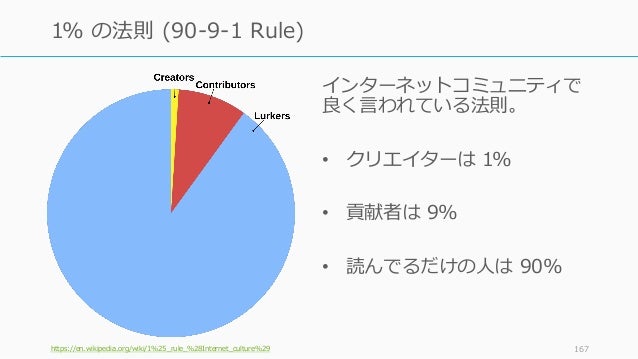 - 167. インターネットコミュニティで 良く言われている法則。 • クリエイターは 1% • 貢献者は 9% • 読んでるだけの人は 90% https://en.wikipedia.org/wiki/1%25_rule_%28Internet_culture%29 167 1% の法則 (90-9-1 Rule)