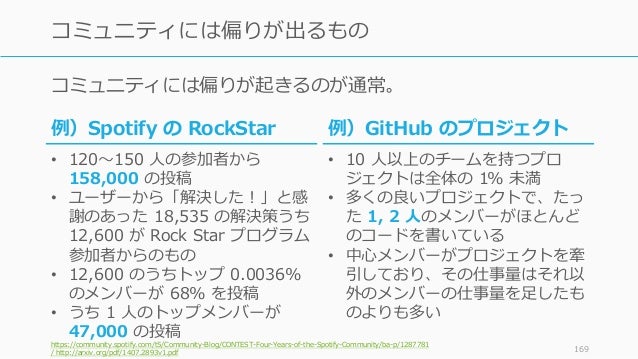 - 169. コミュニティには偏りが起きるのが通常。 https://community.spotify.com/t5/Community-Blog/CONTEST-Four-Years-of-the-Spotify-Community/ba-p/1287781 / http://arxiv.org/pdf/1407.2893v1.pdf 169 コミュニティには偏りが出るもの 例)GitHub のプロジェクト • 10 人以上のチームを持つプロ ジェクトは全体の 1% 未満 • 多くの良いプロジェクトで、たっ た 1, 2 人のメンバーがほとんど のコードを書いている • 中心メンバーがプロジェクトを牽 引しており、その仕事量はそれ以 外のメンバーの仕事量を足したも のよりも多い 例)Spotify の RockStar • 120~150 人の参加者から 158,000 の投稿 • ユーザーから「解決した!」と感 謝のあった 18,535 の解決策うち 12,600 が Rock Star プログラム 参加者からのもの • 12,600 のうちトップ 0.0036% のメンバーが 68% を投稿 • うち 1 人のトップメンバーが 47,000 の投稿