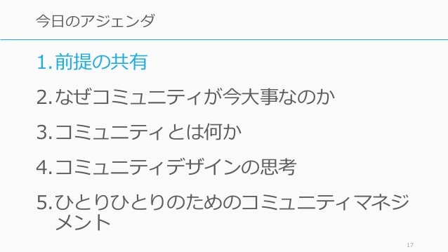 - 16. 1.前提の共有 2.なぜコミュニティが今大事なのか 3.コミュニティとは何か 4.コミュニティデザインの思考 5.ひとりひとりのためのコミュニティマネジ メント 16 今日のアジェンダ