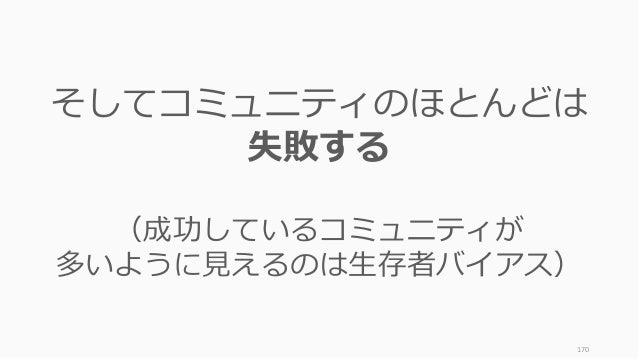 - 170. 170 そしてコミュニティのほとんどは 失敗する (成功しているコミュニティが 多いように見えるのは生存者バイアス)