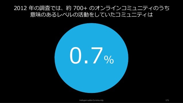 - 171. Indispensable Community 171 0.7% 2012 年の調査では、約 700+ のオンラインコミュニティのうち 意味のあるレベルの活動をしていたコミュニティは