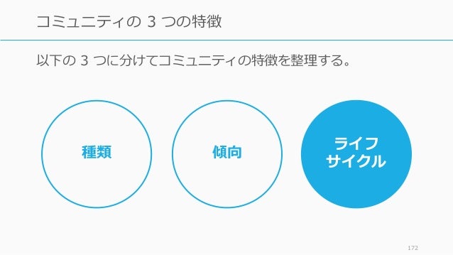 - 172. 以下の 3 つに分けてコミュニティの特徴を整理する。 172 コミュニティの 3 つの特徴 種類 傾向 ライフ サイクル