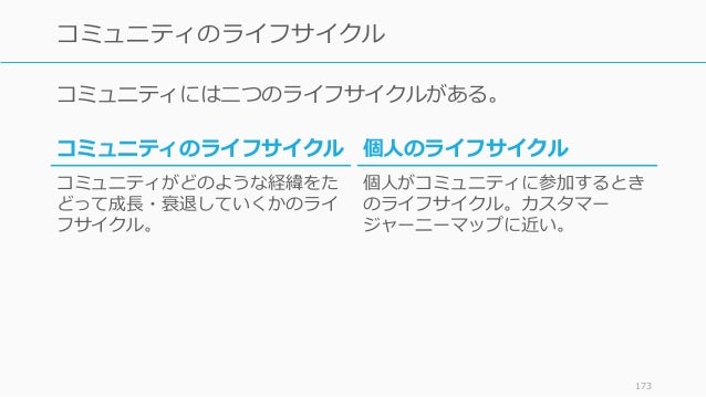 - 173. コミュニティには二つのライフサイクルがある。 173 コミュニティのライフサイクル 個人のライフサイクル 個人がコミュニティに参加するとき のライフサイクル。カスタマー ジャーニーマップに近い。 コミュニティのライフサイクル コミュニティがどのような経緯をた どって成長・衰退していくかのライ フサイクル。