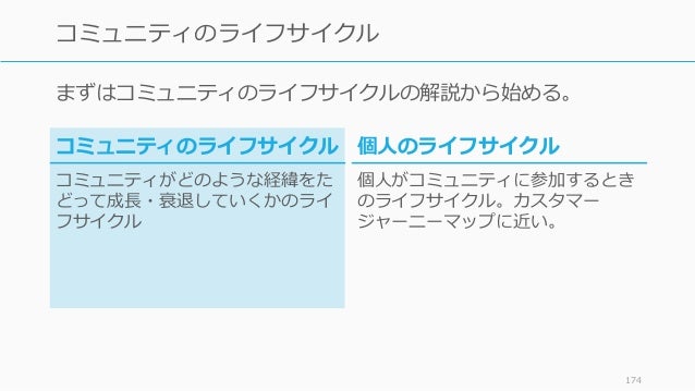 - 174. まずはコミュニティのライフサイクルの解説から始める。 174 コミュニティのライフサイクル 個人のライフサイクル 個人がコミュニティに参加するとき のライフサイクル。カスタマー ジャーニーマップに近い。 コミュニティのライフサイクル コミュニティがどのような経緯をた どって成長・衰退していくかのライ フサイクル