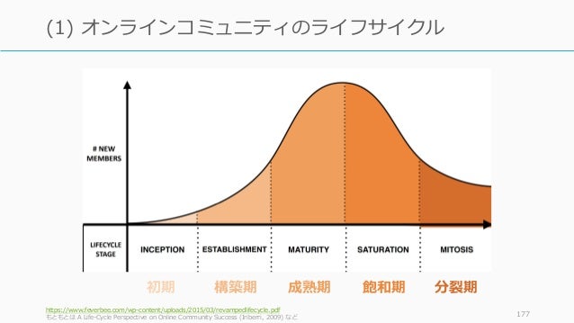 - 177. https://www.feverbee.com/wp-content/uploads/2015/03/revampedlifecycle.pdf もともとは A Life-Cycle Perspective on Online Community Success (Iriberri, 2009) など 177 (1) オンラインコミュニティのライフサイクル 初期 構築期 成熟期 飽和期 分裂期