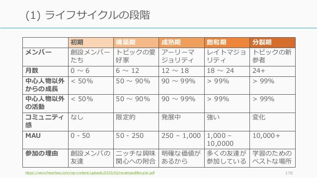 - 178. 初期 構築期 成熟期 飽和期 分裂期 メンバー 創設メンバー たち トピックの愛 好家 アーリーマ ジョリティ レイトマジョ リティ トピックの新 参者 月数 0 ~ 6 6 ~ 12 12 ~ 18 18 ~ 24 24+ 中心人物以外 からの成長 < 50% 50 ~ 90% 90 ~ 99% > 99% > 99% 中心人物以外 の活動 < 50% 50 ~ 90% 90 ~ 99% > 99% > 99% コミュニティ 感 なし 限定的 発展中 強い 変化 MAU 0 - 50 50 - 250 250 – 1,000 1,000 – 10,0000 10,000+ 参加の理由 創設メンバの 友達 ニッチな興味 関心への附合 明確な価値が あるから 多くの友達が 参加している 学習のための ベストな場所 https://www.feverbee.com/wp-content/uploads/2015/03/revampedlifecycle.pdf 178 (1) ライフサイクルの段階