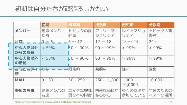 - 179. 初期 構築期 成熟期 飽和期 分裂期 メンバー 創設メンバー たち トピックの愛 好家 アーリーマ ジョリティ レイトマジョ リティ トピックの新 参者 月数 0 ~ 6 6 ~ 12 12 ~ 18 18 ~ 24 24+ 中心人物以外 からの成長 < 50% 50 ~ 90% 90 ~ 99% > 99% > 99% 中心人物以外 の活動 < 50% 50 ~ 90% 90 ~ 99% > 99% > 99% コミュニティ 感 なし 限定的 発展中 強い 変化 MAU 0 - 50 50 - 250 250 – 1,000 1,000 – 10,0000 10,000+ 参加の理由 創設メンバの 友達 ニッチな興味 関心への附合 明確な価値が あるから 多くの友達が 参加している 学習のための ベストな場所 https://www.feverbee.com/wp-content/uploads/2015/03/revampedlifecycle.pdf 179 初期は自分たちが頑張るしかない
