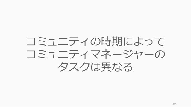 - 180. 180 コミュニティの時期によって コミュニティマネージャーの タスクは異なる