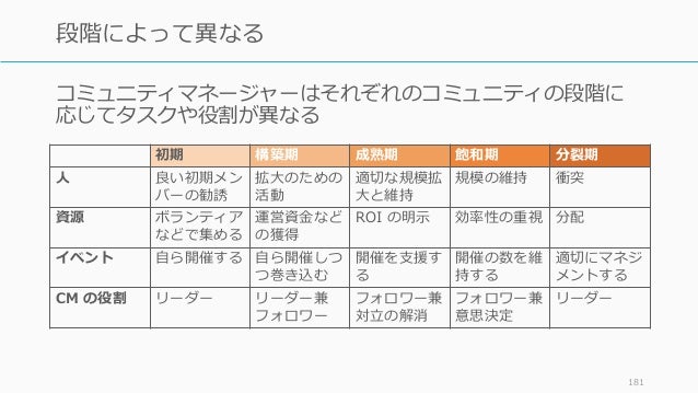- 181. コミュニティマネージャーはそれぞれのコミュニティの段階に 応じてタスクや役割が異なる 181 段階によって異なる 初期 構築期 成熟期 飽和期 分裂期 人 良い初期メン バーの勧誘 拡大のための 活動 適切な規模拡 大と維持 規模の維持 衝突 資源 ボランティア などで集める 運営資金など の獲得 ROI の明示 効率性の重視 分配 イベント 自ら開催する 自ら開催しつ つ巻き込む 開催を支援す る 開催の数を維 持する 適切にマネジ メントする CM の役割 リーダー リーダー兼 フォロワー フォロワー兼 対立の解消 フォロワー兼 意思決定 リーダー