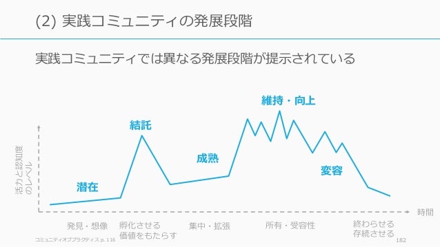 - 182. 実践コミュニティでは異なる発展段階が提示されている コミュニティオブプラクティス p. 116 182 (2) 実践コミュニティの発展段階 潜在 結託 成熟 維持・向上 変容 発見・想像 孵化させる 価値をもたらす 集中・拡張 所有・受容性 終わらせる 存続させる 時間 活力と認知度 のレベル