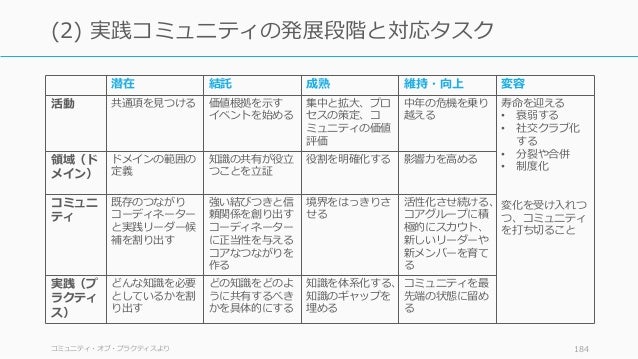 - 184. 潜在 結託 成熟 維持・向上 変容 活動 共通項を見つける 価値根拠を示す イベントを始める 集中と拡大、プロ セスの策定、コ ミュニティの価値 評価 中年の危機を乗り 越える 寿命を迎える • 衰弱する • 社交クラブ化 する • 分裂や合併 • 制度化 変化を受け入れつ つ、コミュニティ を打ち切ること 領域(ド メイン) ドメインの範囲の 定義 知識の共有が役立 つことを立証 役割を明確化する 影響力を高める コミュニ ティ 既存のつながり コーディネーター と実践リーダー候 補を割り出す 強い結びつきと信 頼関係を創り出す コーディネーター に正当性を与える コアなつながりを 作る 境界をはっきりさ せる 活性化させ続ける、 コアグループに積 極的にスカウト、 新しいリーダーや 新メンバーを育て る 実践(プ ラクティ ス) どんな知識を必要 としているかを割 り出す どの知識をどのよ うに共有するべき かを具体的にする 知識を体系化する、 知識のギャップを 埋める コミュニティを最 先端の状態に留め る コミュニティ・オブ・プラクティスより 184 (2) 実践コミュニティの発展段階と対応タスク