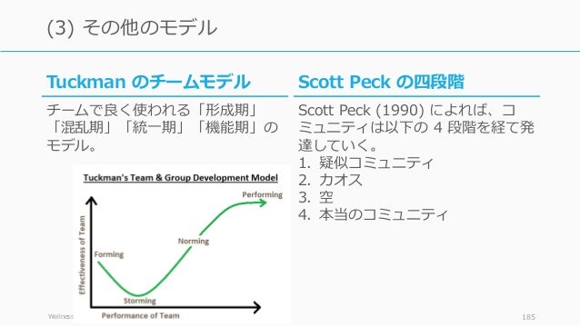 - 185. Wellness for Helping Professionals 185 (3) その他のモデル Scott Peck の四段階 Scott Peck (1990) によれば、コ ミュニティは以下の 4 段階を経て発 達していく。 1. 疑似コミュニティ 2. カオス 3. 空 4. 本当のコミュニティ Tuckman のチームモデル チームで良く使われる「形成期」 「混乱期」「統一期」「機能期」の モデル。