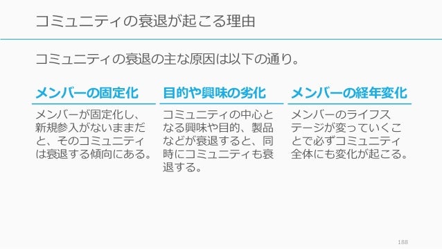 - 188. コミュニティの衰退の主な原因は以下の通り。 188 コミュニティの衰退が起こる理由 メンバーの経年変化 メンバーのライフス テージが変っていくこ とで必ずコミュニティ 全体にも変化が起こる。 メンバーの固定化 メンバーが固定化し、 新規参入がないままだ と、そのコミュニティ は衰退する傾向にある。 目的や興味の劣化 コミュニティの中心と なる興味や目的、製品 などが衰退すると、同 時にコミュニティも衰 退する。