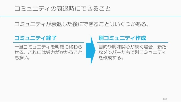 - 189. コミュニティが衰退した後にできることはいくつかある。 189 コミュニティの衰退時にできること コミュニティ終了 一旦コミュニティを明確に終わら せる。これには労力がかかること も多い。 別コミュニティ作成 目的や興味関心が続く場合、新た なメンバーたちで別コミュニティ を作成する。