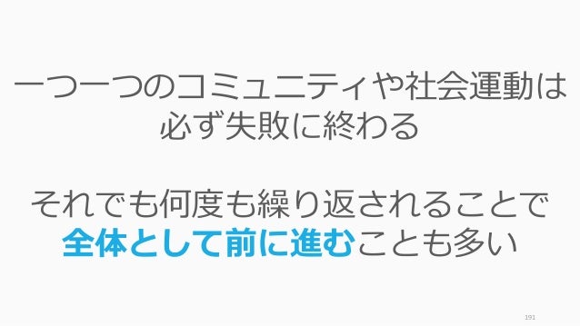 - 191. 191 一つ一つのコミュニティや社会運動は 必ず失敗に終わる それでも何度も繰り返されることで 全体として前に進むことも多い