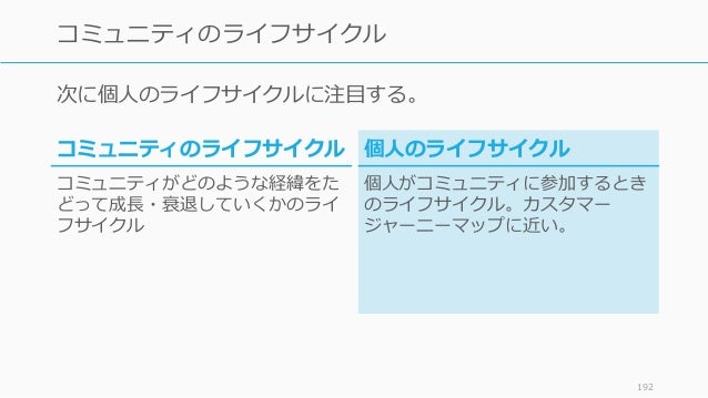 - 192. 次に個人のライフサイクルに注目する。 192 コミュニティのライフサイクル 個人のライフサイクル 個人がコミュニティに参加するとき のライフサイクル。カスタマー ジャーニーマップに近い。 コミュニティのライフサイクル コミュニティがどのような経緯をた どって成長・衰退していくかのライ フサイクル