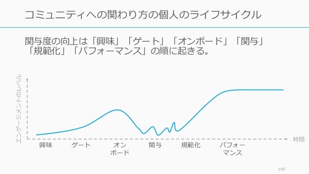- 195. 195 コミュニティへの関わり方の個人のライフサイクル 時間 エンゲージメントのレベル 興味 ゲート オン ボード 関与 規範化 パフォー マンス 関与度の向上は「興味」「ゲート」「オンボード」「関与」 「規範化」「パフォーマンス」の順に起きる。