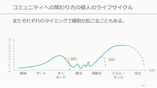 - 196. 196 コミュニティへの関わり方の個人のライフサイクル 時間 エンゲージメントのレベル 興味 ゲート オン ボード 関与 規範化 パフォー マンス 離脱 またそれぞれのタイミングで離脱が起こることもある。 離脱離脱