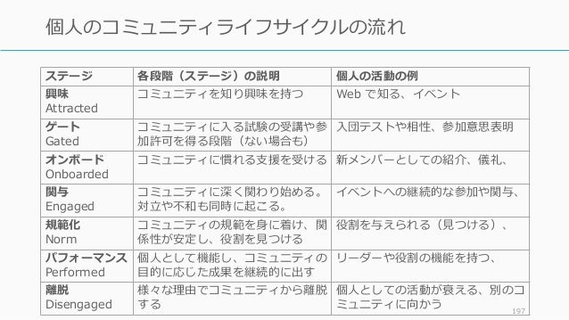 - 197. ステージ 各段階(ステージ)の説明 個人の活動の例 興味 Attracted コミュニティを知り興味を持つ Web で知る、イベント ゲート Gated コミュニティに入る試験の受講や参 加許可を得る段階(ない場合も) 入団テストや相性、参加意思表明 オンボード Onboarded コミュニティに慣れる支援を受ける 新メンバーとしての紹介、儀礼、 関与 Engaged コミュニティに深く関わり始める。 対立や不和も同時に起こる。 イベントへの継続的な参加や関与、 規範化 Norm コミュニティの規範を身に着け、関 係性が安定し、役割を見つける 役割を与えられる(見つける)、 パフォーマンス Performed 個人として機能し、コミュニティの 目的に応じた成果を継続的に出す リーダーや役割の機能を持つ、 離脱 Disengaged 様々な理由でコミュニティから離脱 する 個人としての活動が衰える、別のコ ミュニティに向かう 197 個人のコミュニティライフサイクルの流れ