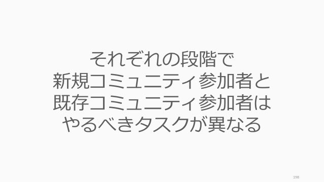 - 198. 198 それぞれの段階で 新規コミュニティ参加者と 既存コミュニティ参加者は やるべきタスクが異なる